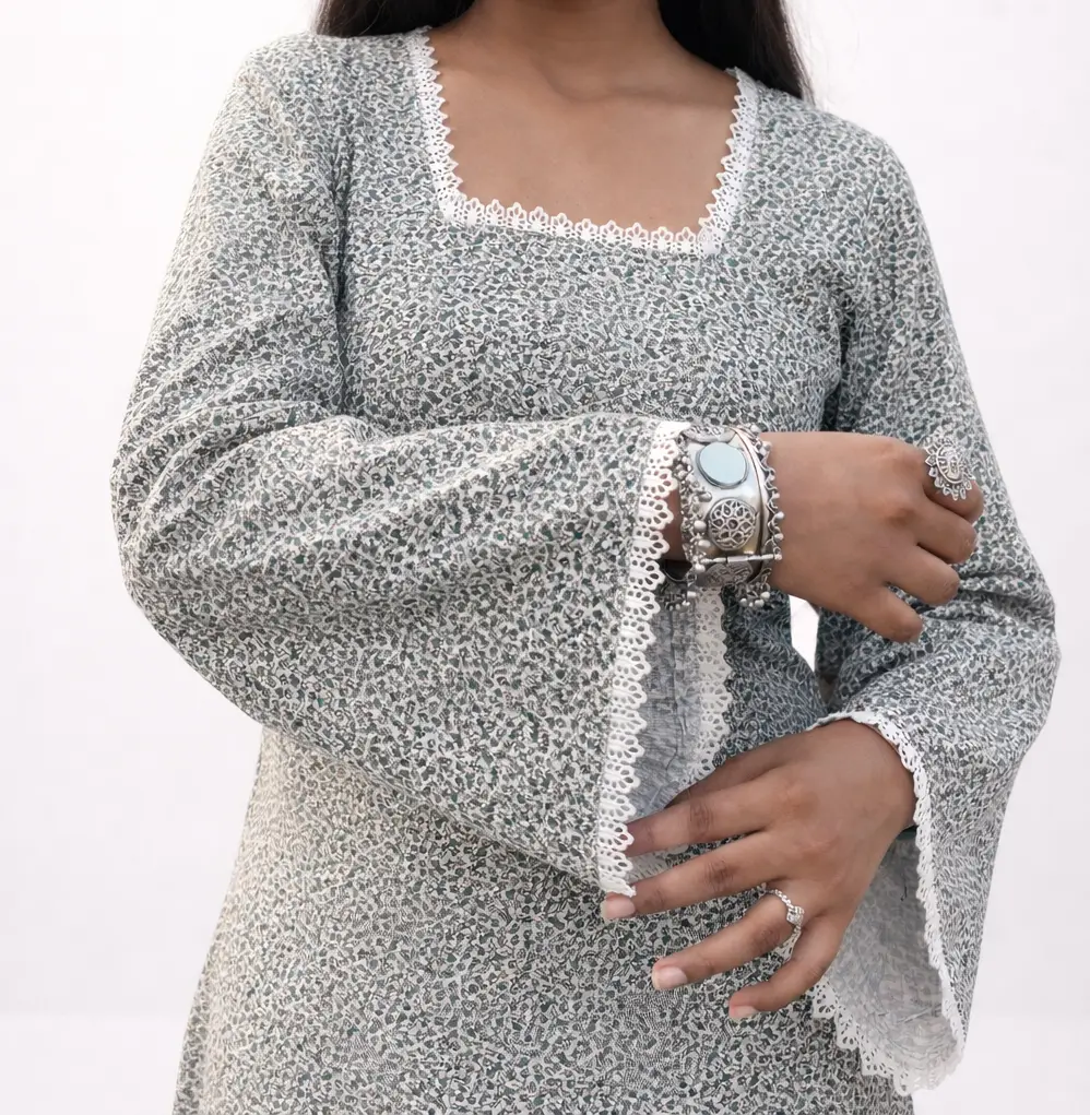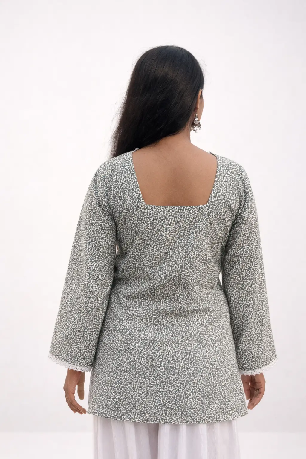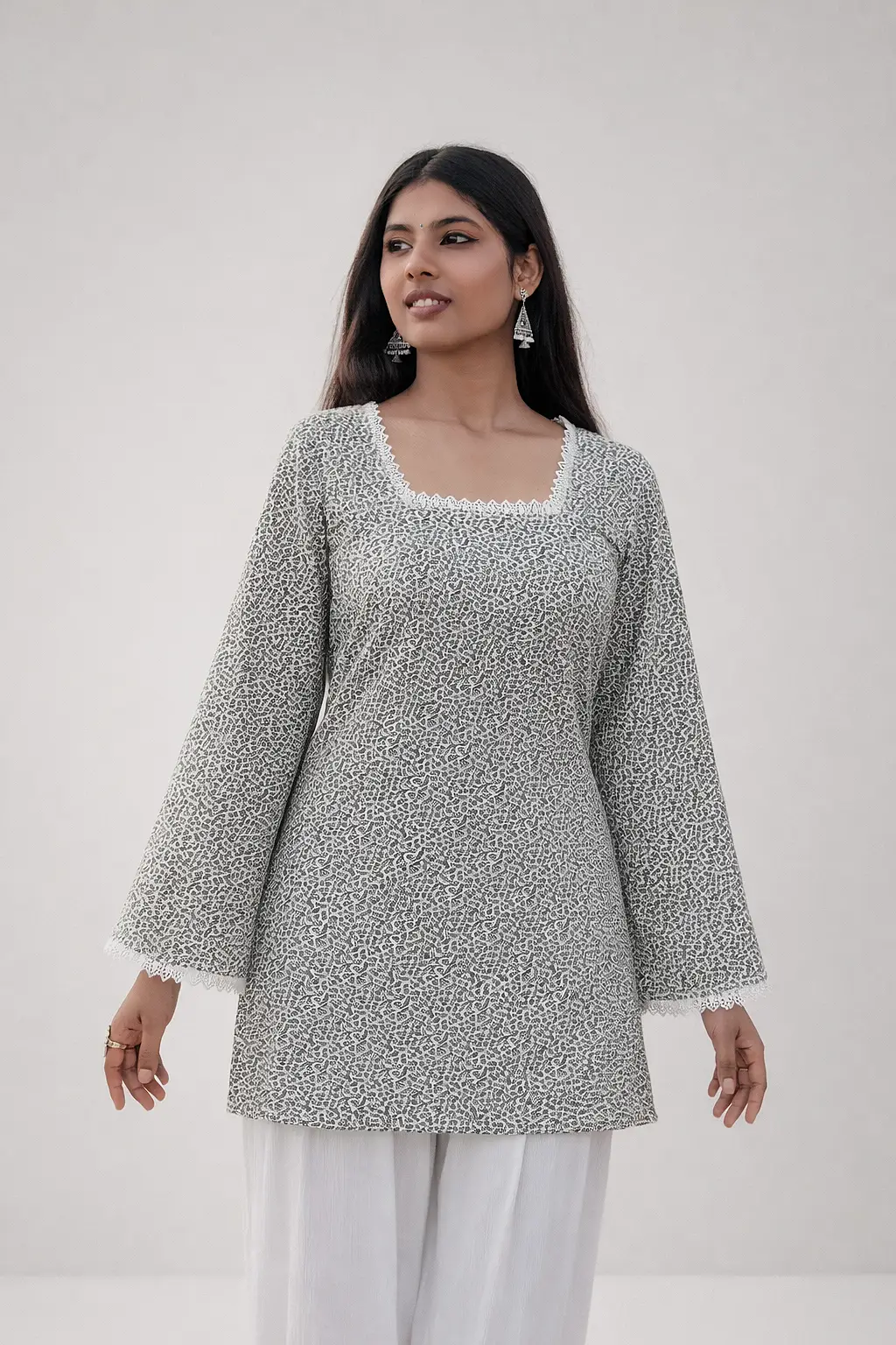 Crafted in pure, breathable Cambric Cotton, this short kurti is designed for everyday comfort without compromising on style. The square neckline adds a modern, structured charm, while the flowy bell sleeves, finished with soft lace detailing 🤍, bring in a touch of femininity and movement.
