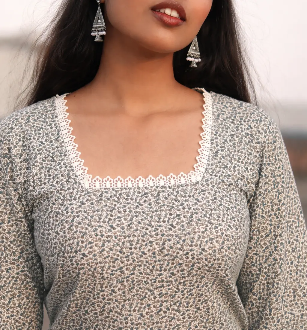 Rooted in nature’s calm, the Harini Kurti blooms with delicate floral prints 🌿 in soothing olive-brown and deep teal hues on a soft ivory base, creating an earthy yet refreshing look that feels effortlessly elegant.