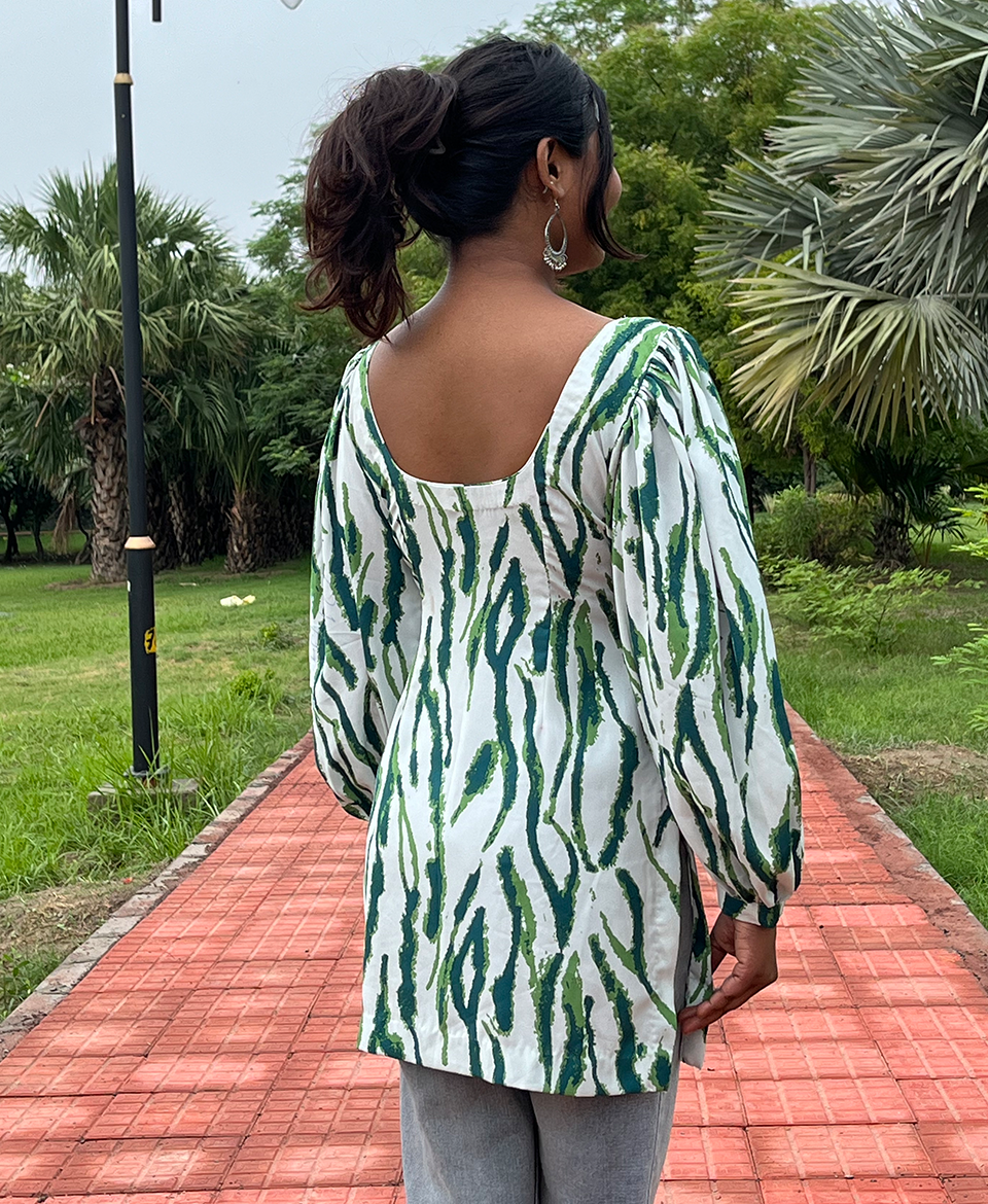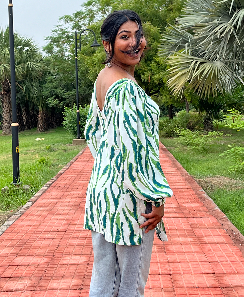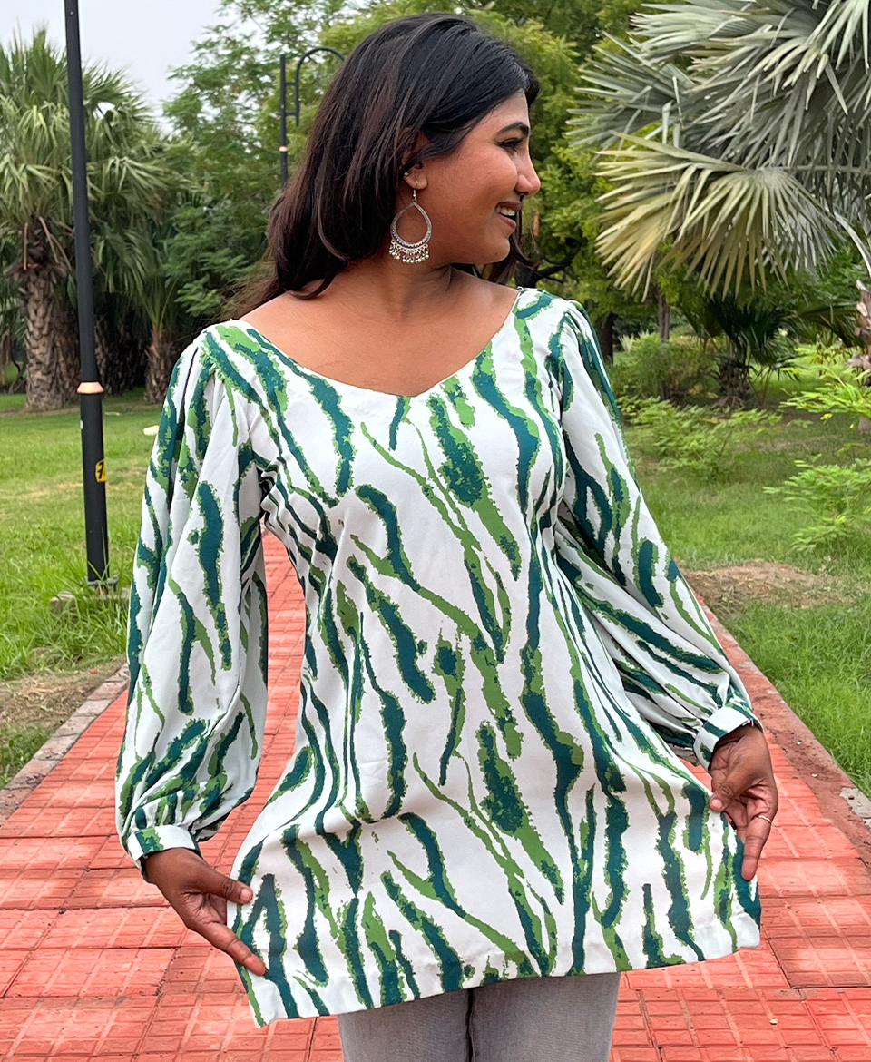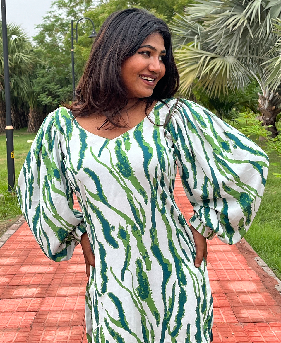 The Rooted Soul Kurti in soft crape fabric brings flow and elegance together. Featuring a sweetheart neckline, balloon sleeves, and a soothing green-teal abstract print on a white base, it’s a breezy statement piece that keeps you stylish, grounded, and effortlessly graceful.